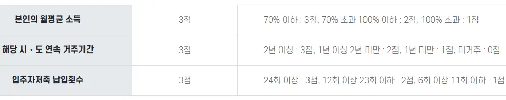 | 1 | 3년 이상의 기간 동안 무주택세대구성원으로, 저축총액(10만원/1회)이 많은 자 |
