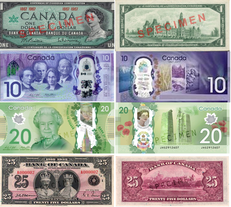 ✅ 기념지폐 : 현재까지 1달러 (1967년 발행, 캐나다 건국 100주년 기념지폐), 10달러 (2017년 발행, 캐나다 건국 150주년 기념지폐), 20달러 (2015년 발행, 엘리자베스 2세의 역사적 통치 기념지폐), 25달러 (1935년 발행, 조지 5세의 은경식 기념지폐) 4권 종이 발행되었습니다.